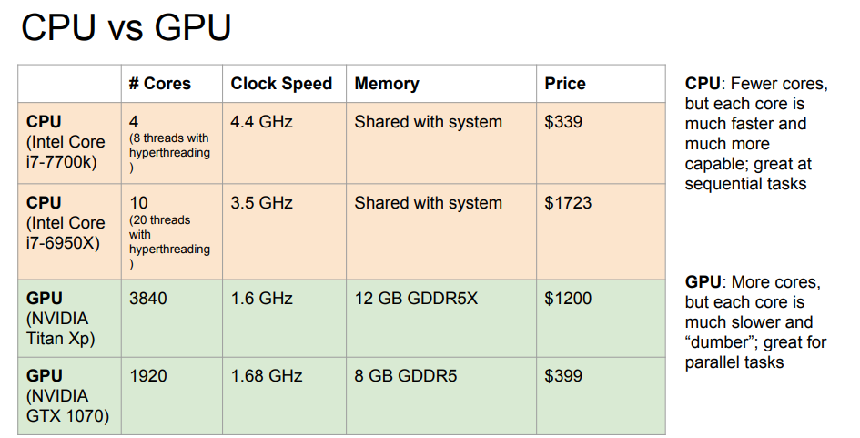 CPU는 순차처리 방식이기 때문에 많은 연산을 한꺼번에 할 수가 없고 느리다.