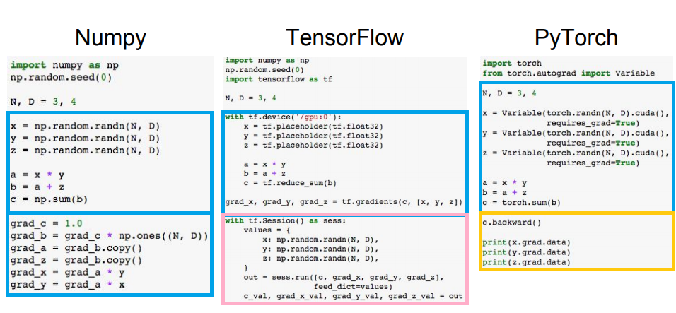 위쪽은 식을 정렬하고 아래는 식을 실행하는 부분이다 - PyTorch식은 다른 두개에 비해 더 간단해 보인다. c.backward()로 연산을 수행한다.