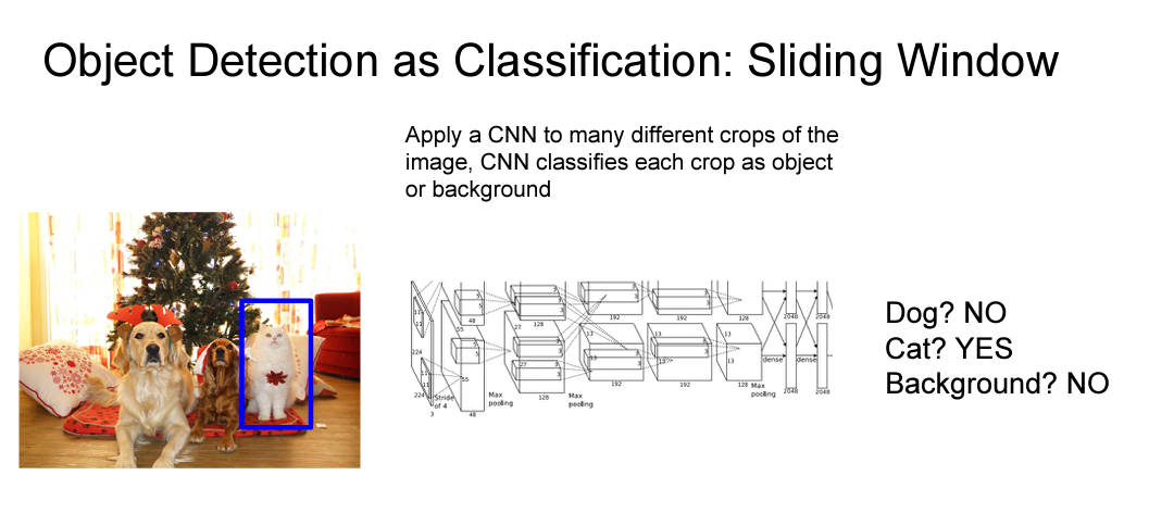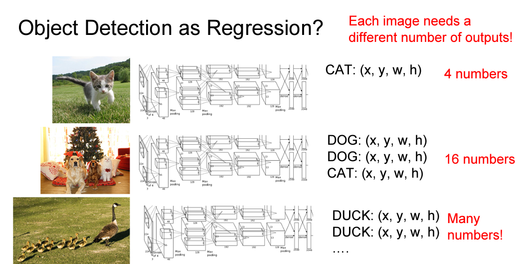 Object Detection은 입력 이미지의 객체 수를 알지 못합니다. input image에 따라 다른 output이 나옵니다. 따라서 Regression로 풀기 상당히 어렵습니다.