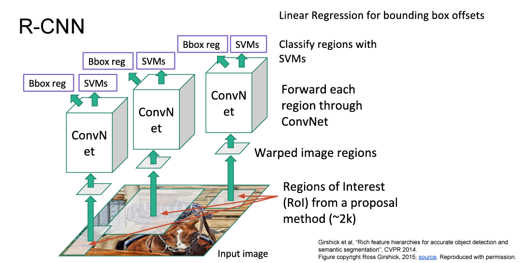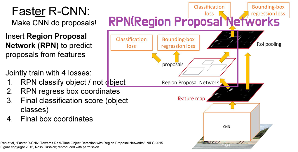 이제는 모든 위치를 다 고려하는 것이 아니라 Region Proposals Networks를 적용해서 객체가 있을법한 Region Proposals를 얻어냅니다. 이것을 CNN의 입력으로 넣으면 이전 방법보다 훨씬 계산량을 감소시킬 수 있을 것입니다.