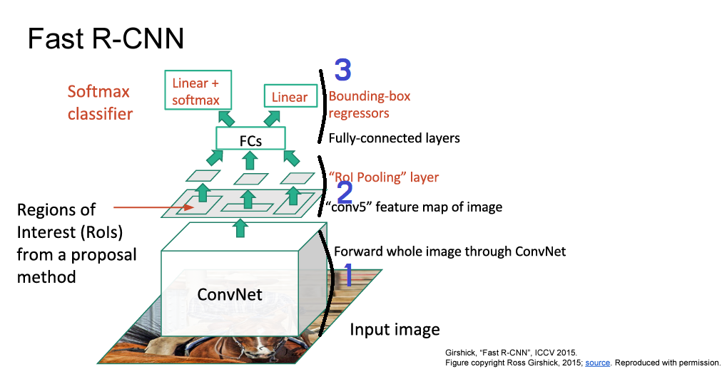 하지만 Fast R-CNN 모델은 먼저 이미지에서 ROI 영역 추출 후 CNN을 거쳐서 Feature Map을 뽑고 거기에 처음에 뽑아둔 ROI영역을 적용 시키기 때문에 Feature들을 공유하면서 더 빠르게 작업을 수행할 수 있습니다. 즉, input이 R-CNN은 2000장 정도였다면 현재는 1장입니다.