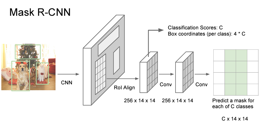 Faster R-CNN와 유사합니다. ROI Align(Pooling)까지는 동일하지만 거기서 BBox마다 Segmentation mask를 예측하도록 합니다.