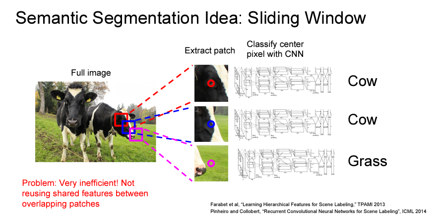 - Patch를 만들고, 사진의 전체를 모두 돌면서 한 픽셀이 어느 클래스에 들어가는지 예측하는 방법