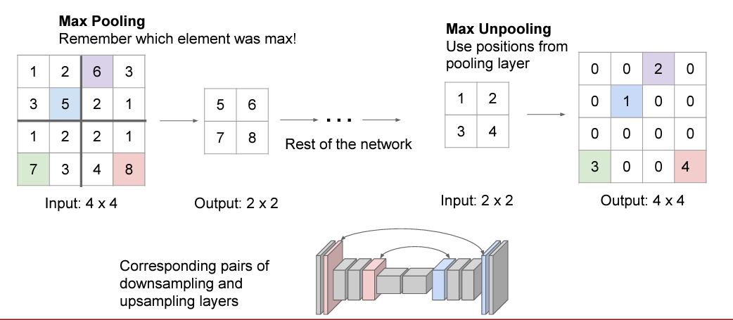 Max pooling시에 선정된 Region을 기억하고 있다가 unpooling할 때 해당 Region에 값을 채우고 나머지는 0으로 통일합니다.