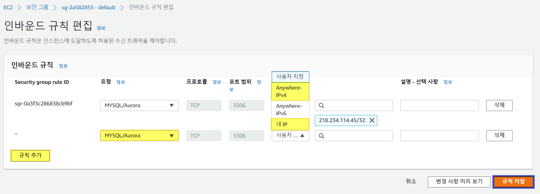 3. 규칙 추가 - MySQL - IP 설정 - 규칙추가