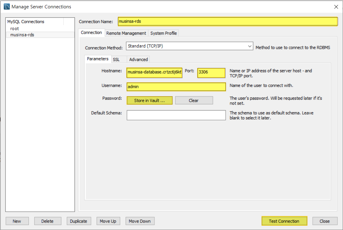 - Hostname: RDS DB인스턴스의 엔드포인트